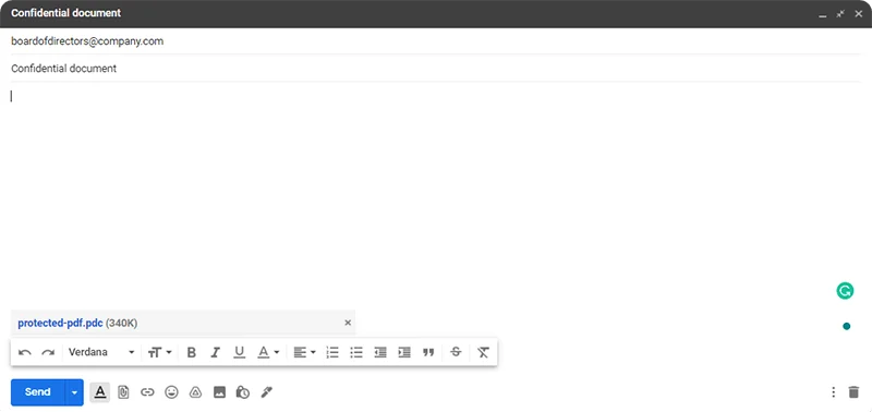 Once you have applied all of the necessary controls to your document and published it, you can send the secure PDF file over email as you would any other file. As users cannot open it unless they have a valid license file on their computer and the file is protected with 256-bit AES encryption, there are no risks associated with its interception.