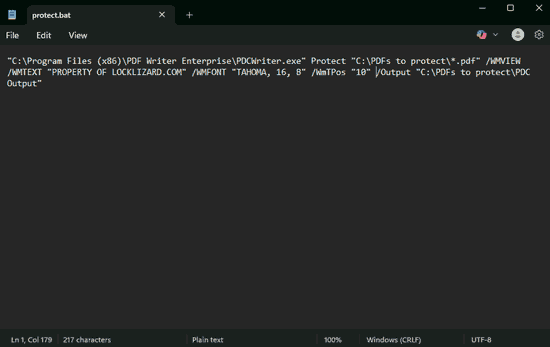 "C:\Program Files (x86)\PDF Writer Enterprise\PDCWriter.exe" Protect "C:\PDFs to protect\*.pdf" /Output "C:\PDFs to protect\PDC Output"