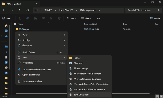 - Right-click in the folder containing your PDFs and choose “New > Text Document”. Rename it to “protect.bat”.