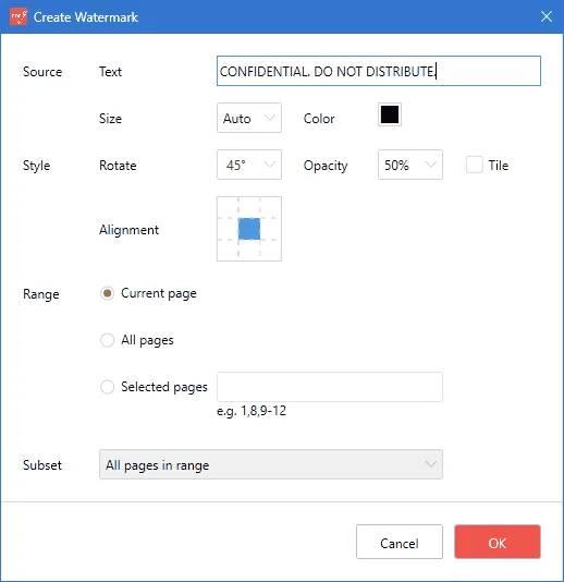 Follow the same process as for view watermarks, adding confidential text and / or a confidential image to your PDF content.