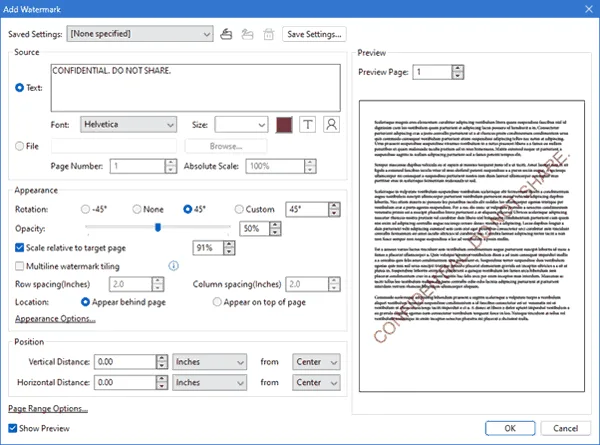 Adding a confidential text watermark in Safeguard Secure PDF Writer