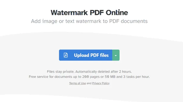 - Go to the online PDF watermark website, press “Upload PDF files” and select the document(s) you want to watermark.