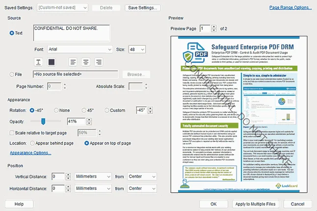 With that in mind, here’s how to watermark a PDF by adding a confidential watermark in Safeguard PDF Security. You can add both text and image watermarks in the same document, different watemarks for when a document is viewed and printed, or just a view or print watermark.