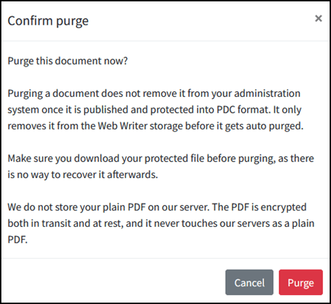 Purging a document does not remove it from your Locklizard administration system once it is published and protected into PDC format. It only removes it from the Web Writer storage before it gets auto purged.